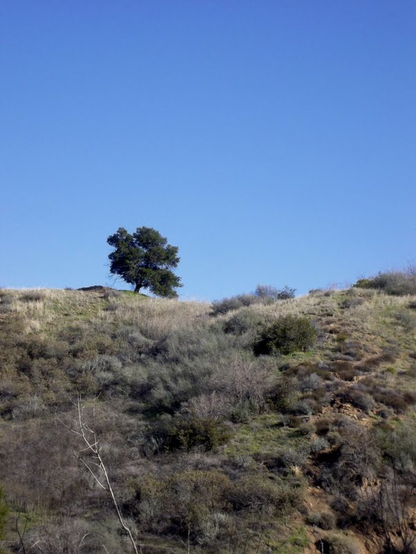 This picture, to me, shows what these mountains are all about: an oak tree, on a ridge line, with blue sky and scrubby chaparral-like stuff. In this case, that's probably